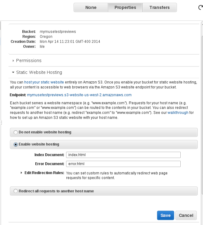- S3 Website: enter the endpoint website with http://, ex: http://mymusetestpreviews.s3-website-us-west-2.amazonaws.com