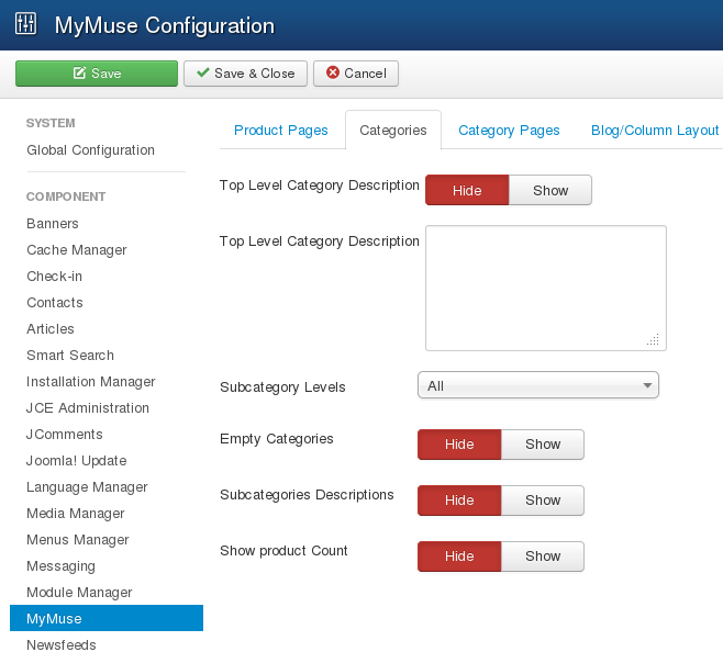 - Top Level Category Description: (Hide/Show). Hide or Show the description of the top-level category.